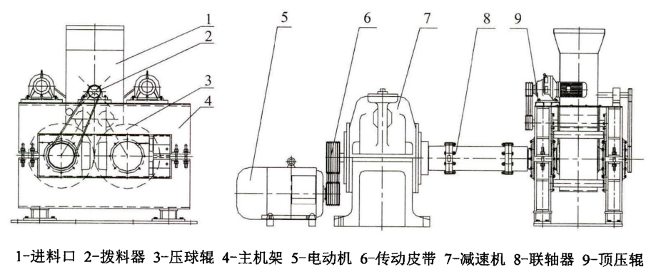 壓球機(jī)是生產(chǎn)線的關(guān)鍵設(shè)備,其主體結(jié)構(gòu)是一對(duì)相向轉(zhuǎn)動(dòng)的壓輥,其中一個(gè)壓輥是固定安裝的,另一個(gè)壓輥為活動(dòng)輥,通過(guò)液壓系統(tǒng)支撐在機(jī)架上,壓輥的表面有定制的模具,當(dāng)物料定量連續(xù)進(jìn)入或通過(guò)預(yù)壓機(jī)強(qiáng)制進(jìn)入壓輥中間時(shí),物料就被壓縮成型。